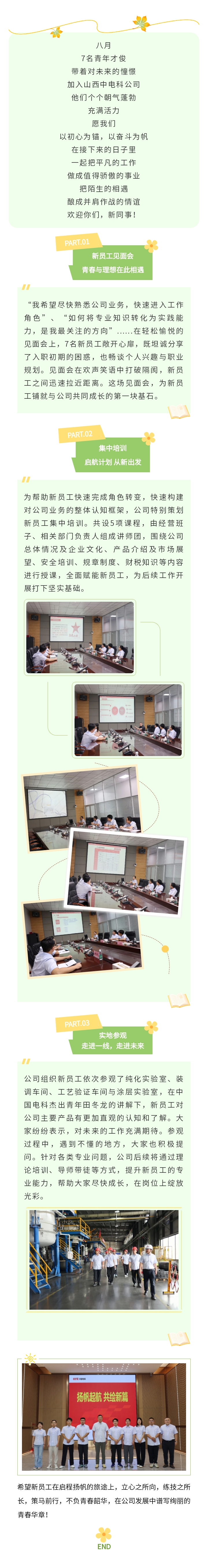 On August, seven young talents joined Shanxi Zhongdian Technology Company with hopes for the future. Each of them is full of vitality and energy. May we anchor ourselves with our original aspirations and set sail with hard work, turning ordinary tasks into proud careers and transforming unfamiliar encounters into comradeship. Welcome, new colleagues!